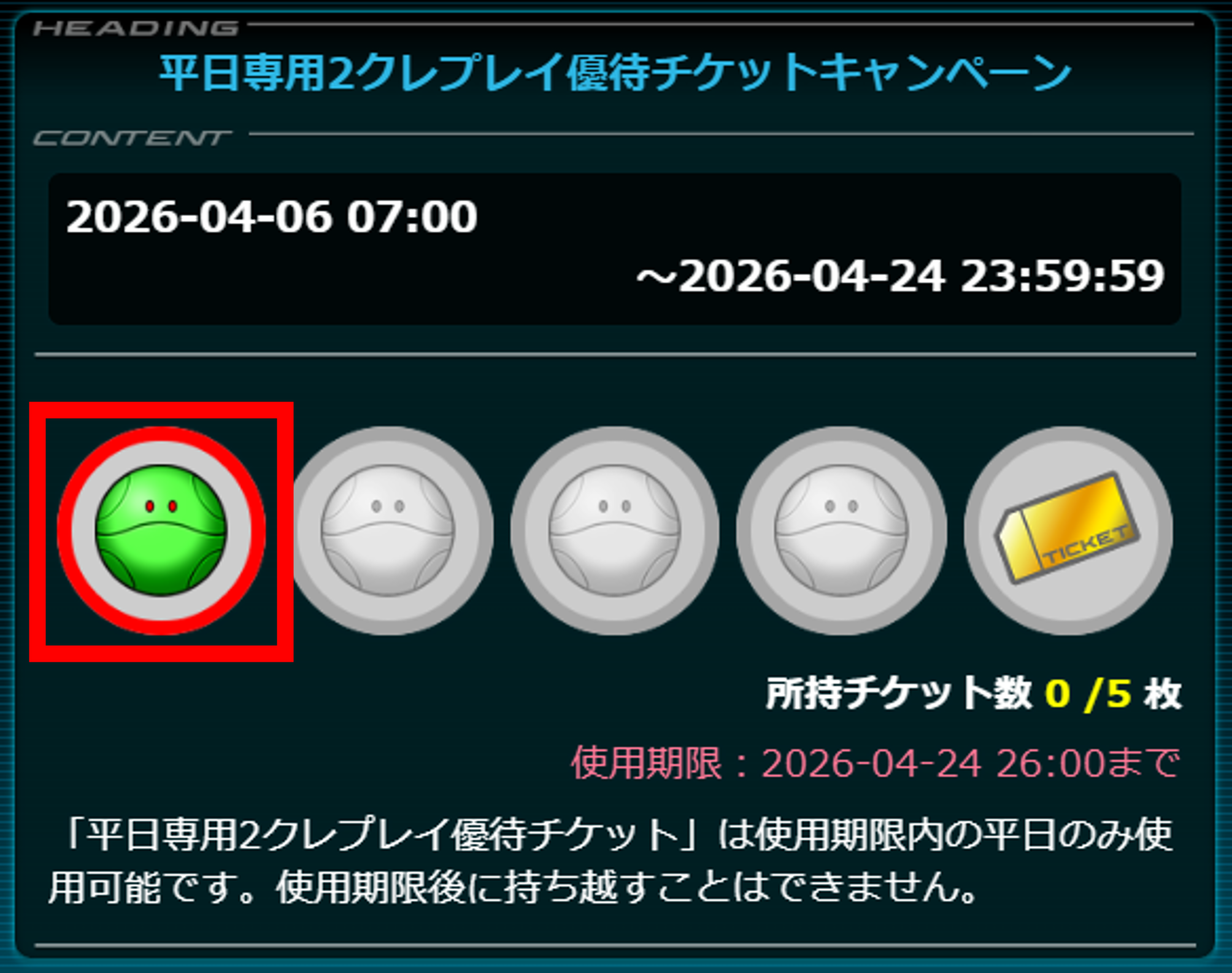 - 本キャンペーンで獲得できる優待チケットは最大5枚まで所持できます。5枚所持している状態でゲームをプレイしてもハロスタンプは貯まりませんがチケットを消費することで、再度ハロスタンプを貯めることができます。